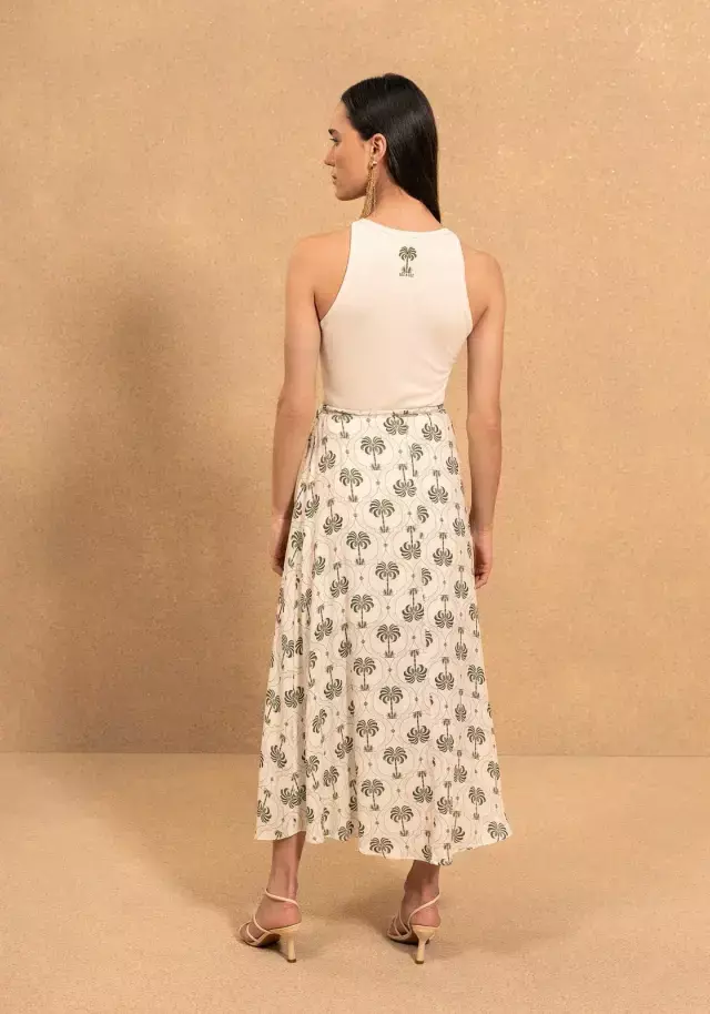Saia midi confeccionada em tecido Rayon New Slub, leve e com textura suave. Estampa Maxi Palm em tons de verde, exclusiva da marca. Modelagem reta com caimento fluido, cós com elástico nas costas para melhor ajuste e fechamento lateral por zíper invisível. Barra simples e sem recortes, ideal para looks casuais e frescos.