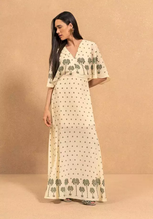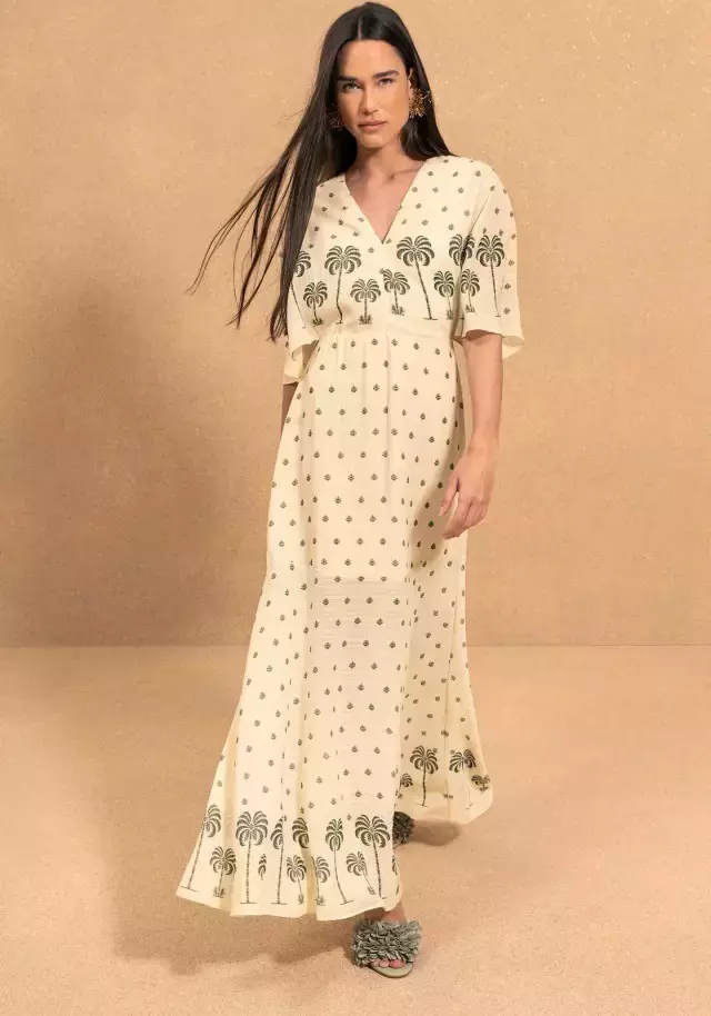 Vestido confeccionado em tecido leve com estampa Alhambra em tom bege. Modelo midi com alças finas ajustáveis, decote em V e modelagem fluida. A peça não possui recortes, garantindo caimento solto e confortável ao corpo. Ideal para composições casuais e dias de clima quente.